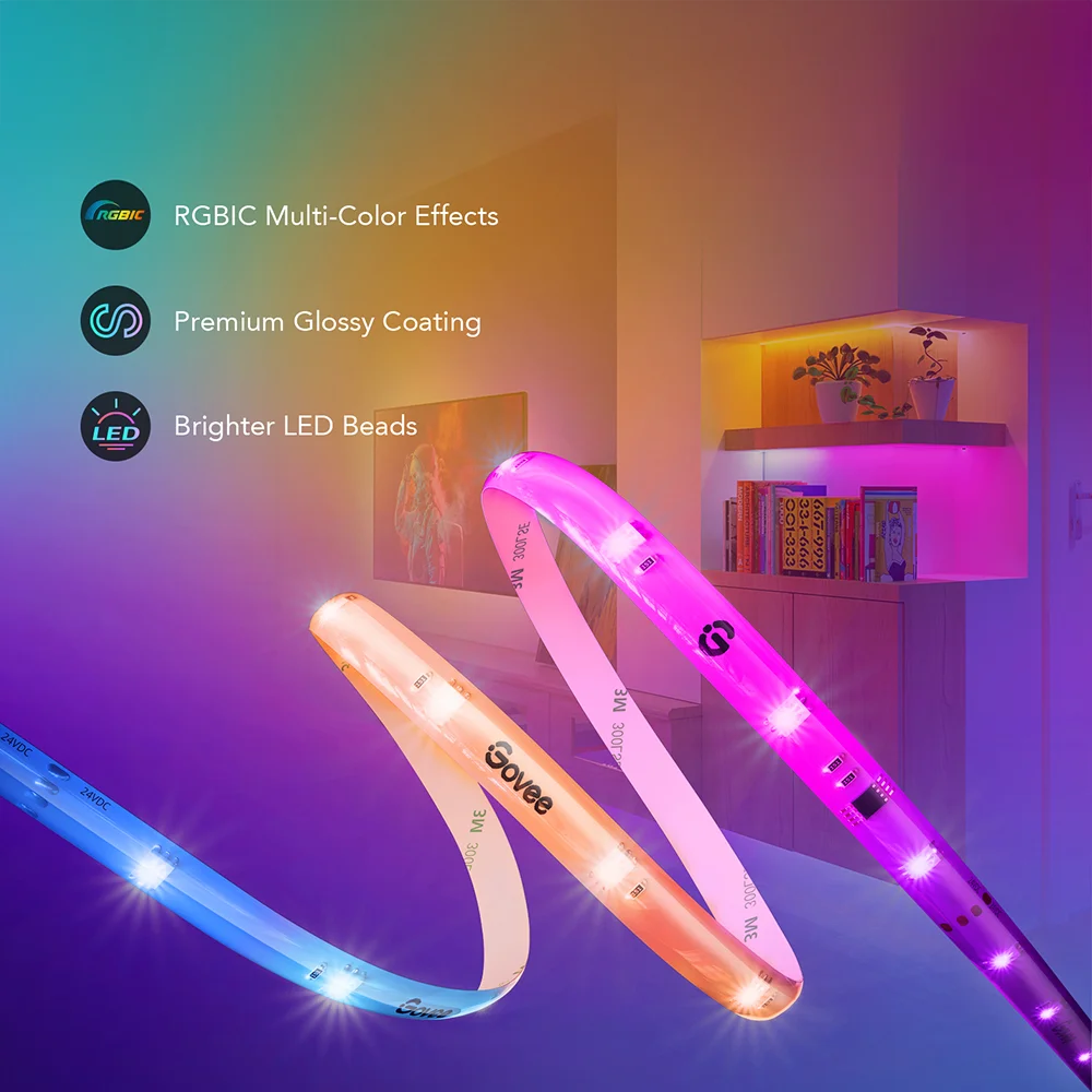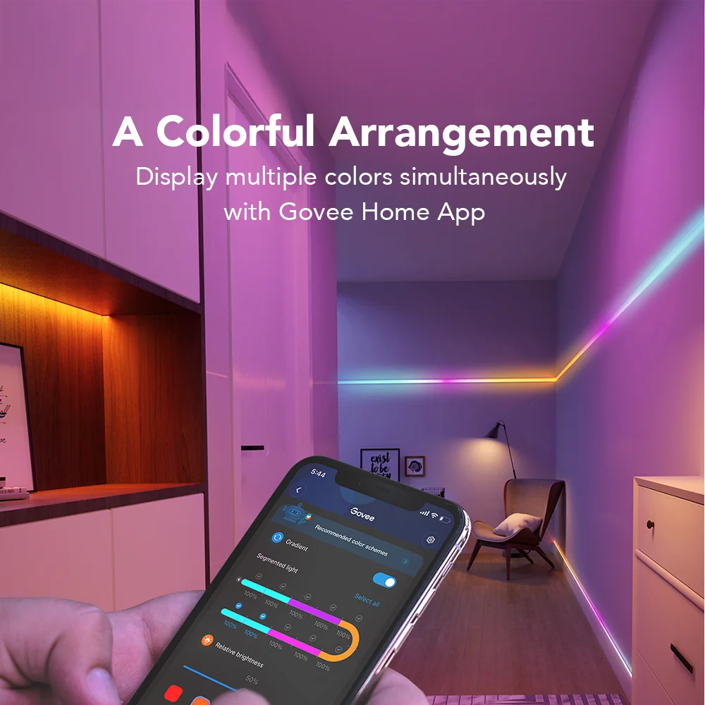 La Tira Led Govee cuenta con tecnología RGBIC, lo que permite mostrar varios colores simultáneamente en una sola tira, creando efectos dinámicos impresionantes. Personaliza cada segmento para obtener una iluminación envolvente y única.