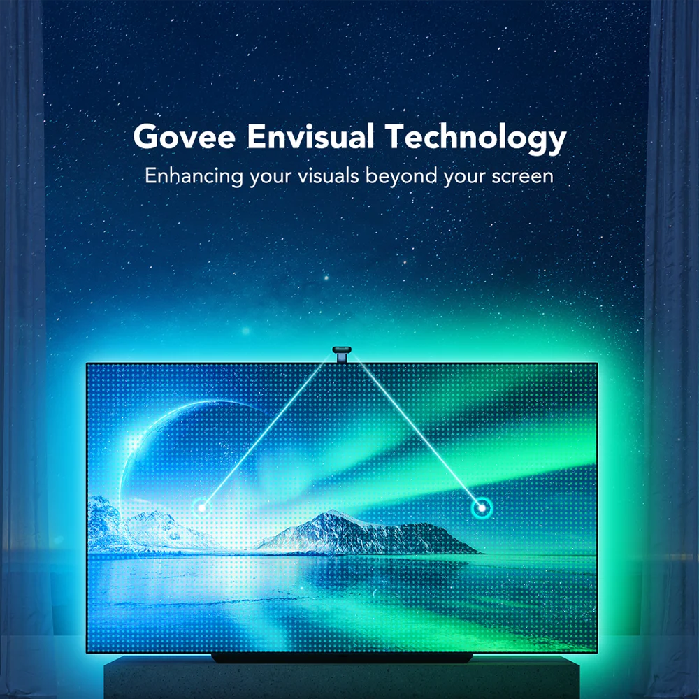 Las Luces LED para TV Govee Envisual cuentan con una innovadora cámara dual que analiza los colores de la pantalla en tiempo real y los replica en la iluminación trasera del televisor. Esto crea un efecto envolvente que expande la imagen más allá de la pantalla, mejorando la inmersión en películas, videojuegos y series.